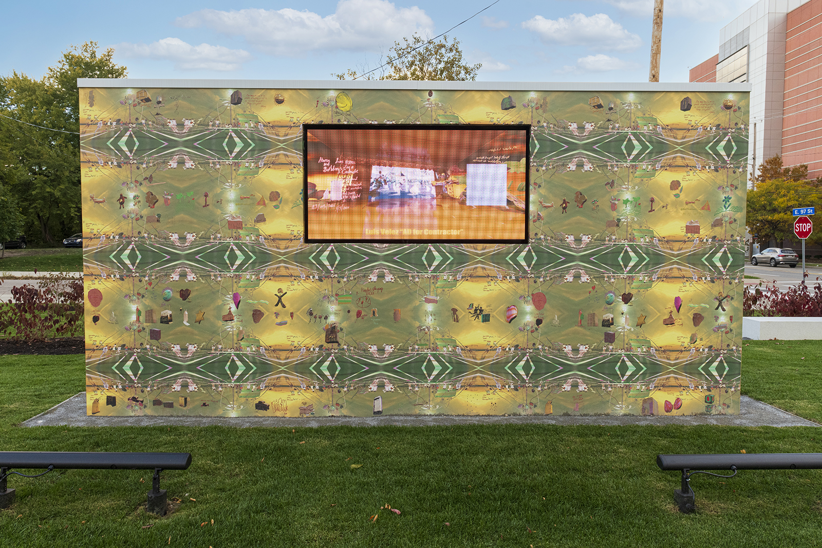 FRONT Triennial Published June 21, 2022 at 1600 × 1067 in 18 things to do in summer 2022 in Greater Cleveland ← Previous Next → Jacolby Satterwhite (b. 1986, Columbia, S.C.; lives in Brooklyn, N.Y.), “Dawn,” (2021). HD color video and 3D animation with artist-designed wallpaper on masonry wall, Cleveland Clinic, as part of FRONT International. Photo / Cleveland Clinic. Share this:Click to share on Twitter (Opens in new window)Click to share on Facebook (Opens in new window)Click to share on Pinterest (Opens in new window)Click to email a link to a friend (Opens in new window)Click to print (Opens in new window)