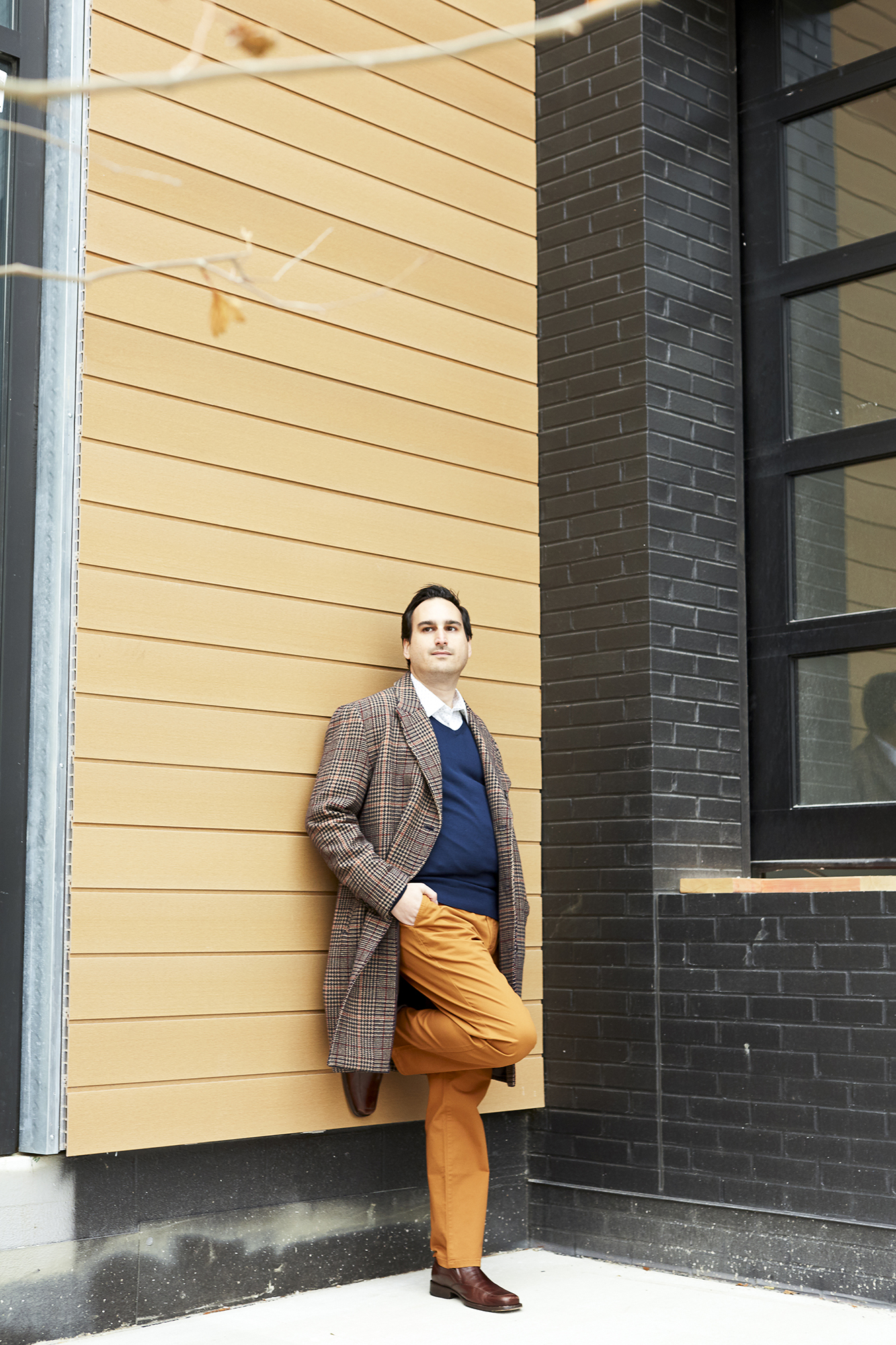 Barry wears the Daily Grind Blue Manchester Diamond dress shirt, navy blue merino V-neck sweater, copper pots-colored chinos, and The Italian Topcoat, all by and from Bonobos in Shaker Heights. Shoes by Johnston & Murphy are his own.
