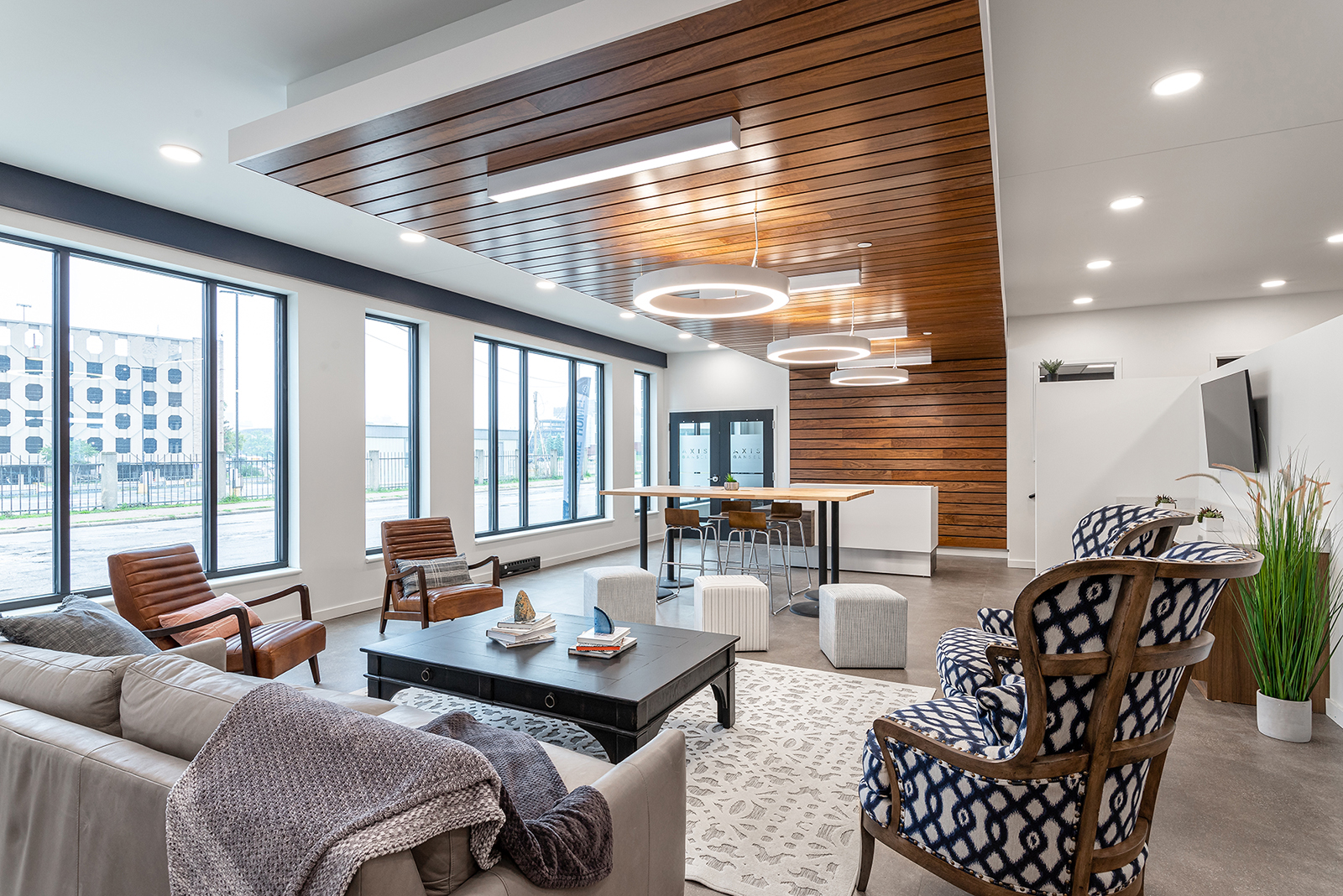 A model kitchen and living room in a rental unit at Axis @ Ansel.