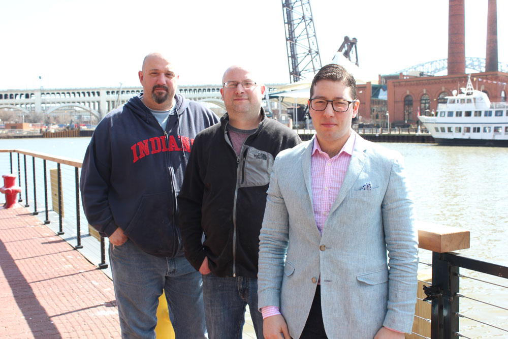 Front to back, Collision Bend Brewing Co. director of service Julian Bruell, Collision Bend Brewing Co. executive chef Andy Dombrowski and Collision Bend Brewing Co. brewmaster Luke Purcell stand on Collision Bend’s main patio. The turn in the Cuyahoga River from which the brewpub gets its name is a little farther downstream, not the turn behind the trio.