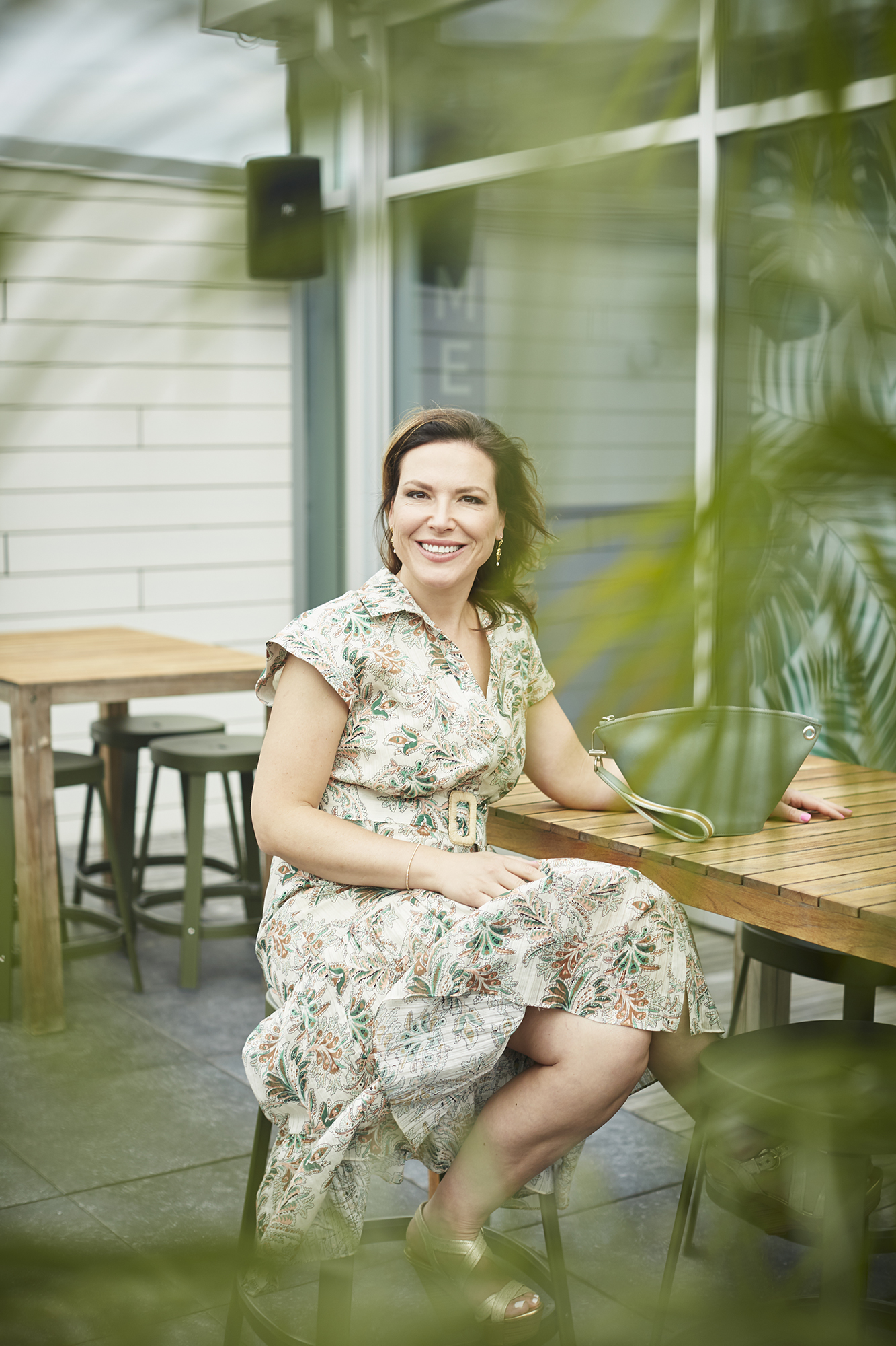Marianne wears a Vanessa floral dress by Veronica Beard from Kilgore Trout. Birdy moon clutch in pistachio is from Shinola. Metallic wedges by BCBG are her own.