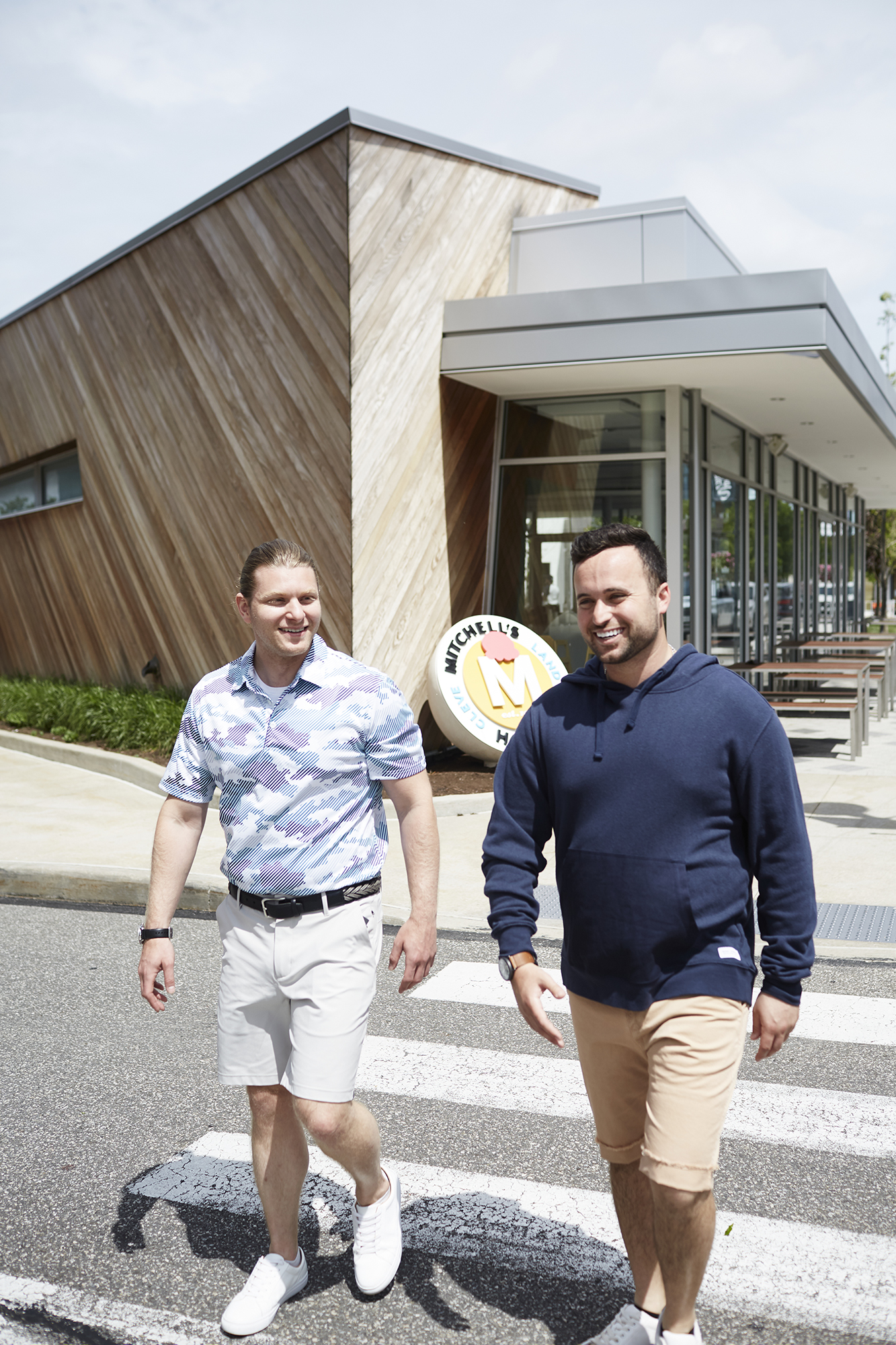 A staple of the Van Aken District – and across Northeast Ohio – Mitchell’s Ice Cream is a consistently great way to beat the heat with sweet treats. After opening the location in 2018, the scoop shop owned by brothers Pete and Mike Mitchell offers classic menu items now quite well-known to Mitchell’s customers, while regularly featuring new flavors – including great dairy-free and vegan options. Jake wears a short-sleeve wicking polo shirt by Robert Graham, shorts/swimwear combo by 7 Diamonds and belt by Torino, all from Ticknors; black Duck watch is from Shinola; sneakers by Vince Camuto are his own. Trevor wears a blue hoodie by Banks Journal and ourCaste tan shorts, both from Whiskey Grade; Runwell watch is from Shinola; sneakers by H&M are his own.